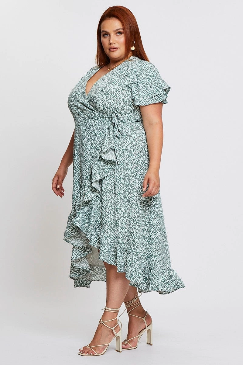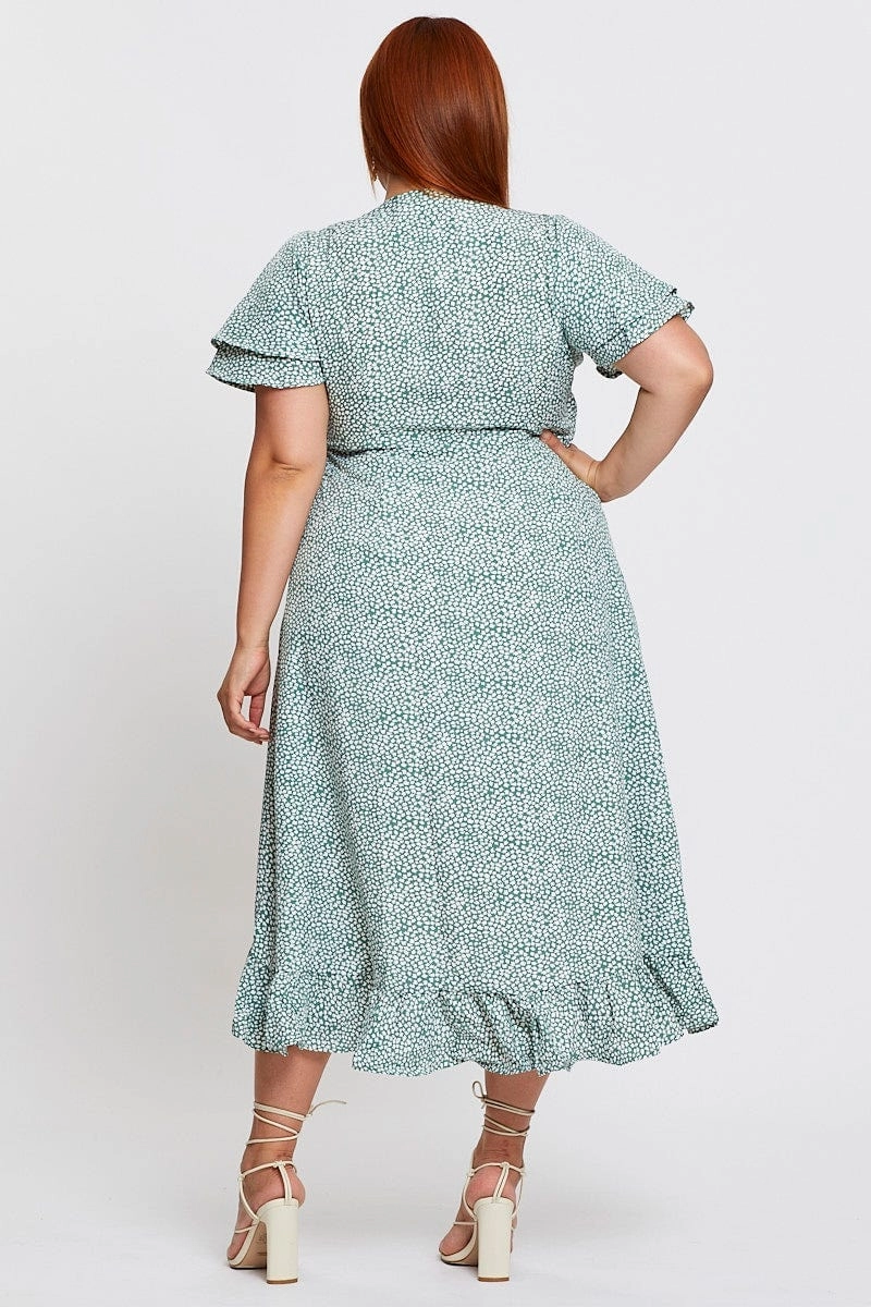 Feature: Geo Print, Short Sleeves, Wrap Design, Frill Hem