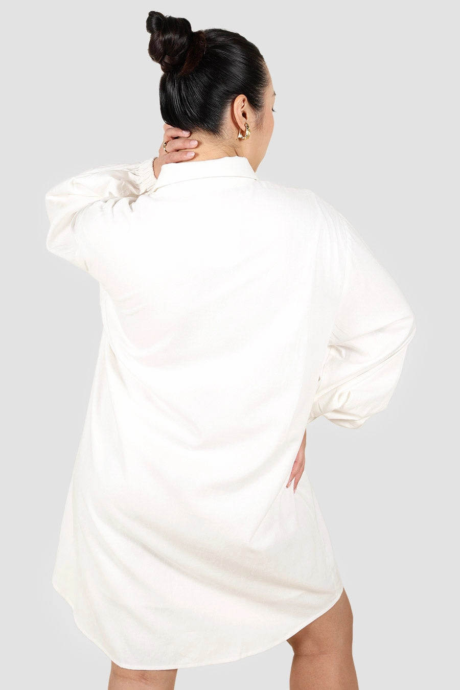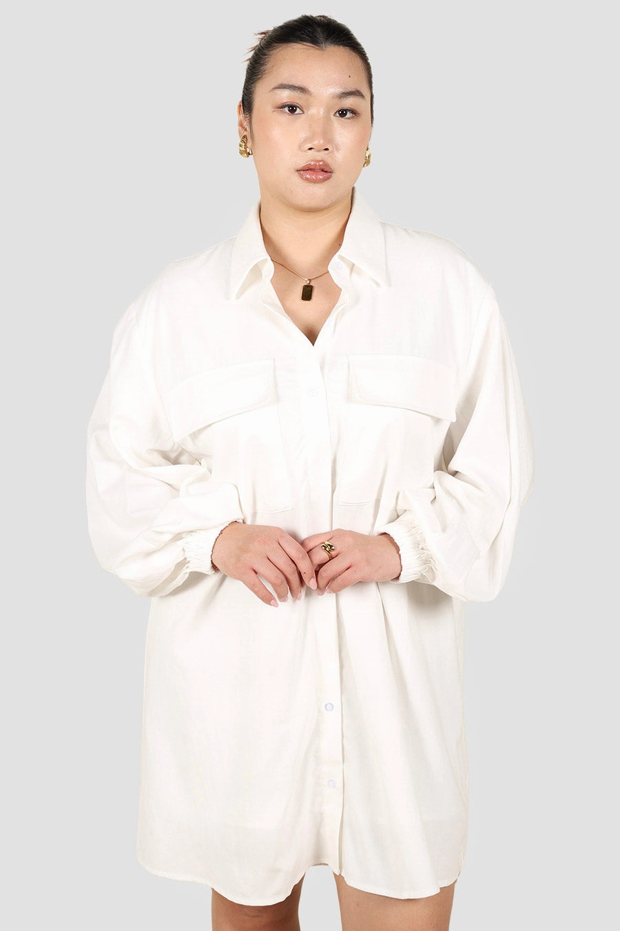 The Roran Dress brings structure and softness together in one timeless silhouette. Designed with a classic collared neckline, full button front, and twin chest pockets, shes equal parts polished and relaxed. Her wide sleeves fall into a soft billow, finishing with an elastic cuff that adds subtle volume.